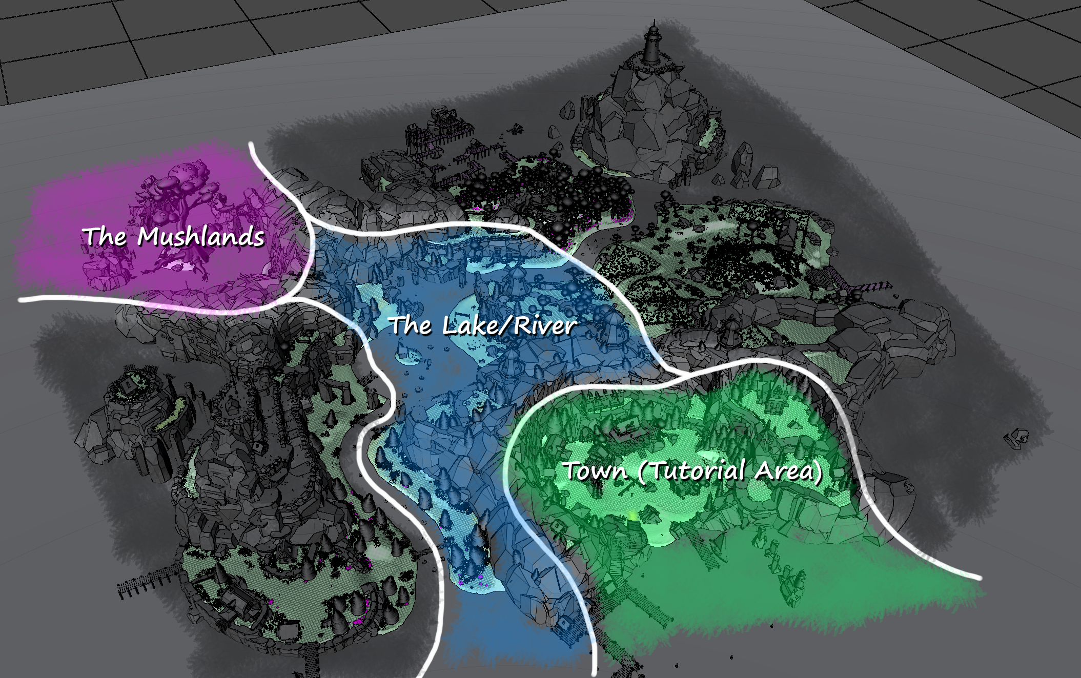 We divided the world into a couple of different biomes, each in their own layer so that we could work in the same scene at simultaneously. I was responsible for the Tutorial area as well as two more areas on the island.